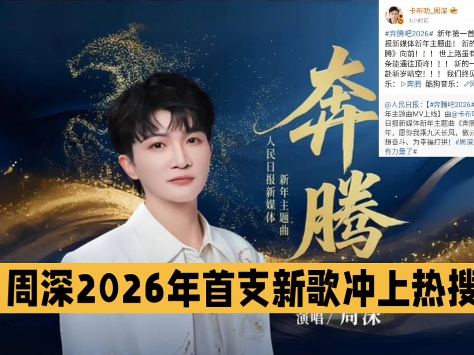 事实上,《奔腾》能引发破圈效应并不意外。歌曲上线仅三天,全网播放量就突破3亿,不仅登上2026年全网热门歌曲TOP10榜首,还成为短视频平台上“新年励志”主题的首选BGM。从职场新人的开工vlog,到考研学子的冲刺视频,再到游戏玩家的高光时刻混剪,这首歌曲以极强的适配性渗透到年轻人生活的各个场景。正如一位听众留言所说:“周深的歌声里,藏着每个普通人的奋斗故事——我们或许渺小如蜉蝣,却都在努力争那一线生机。”在这个充满不确定性的时代,《奔腾》就像一剂强心针,用音乐的力量点燃了无数人心中的火焰。
